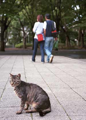 何を求めて歩き回るのか何をしたいのかわからないまま、それでも人のいるところに居たくて、 一人都内をぐるぐる回る。こんな時に写真という趣味は、絶好の言い 訳になる。元気な少女たち、忙しそうなサラリーマン、仲の良さげな カップルは至る所に居てうざったいくらい。電車の中で雑誌を拾う老人。渋谷の宮下公園を歩いていたらどこから持ってきたか分からない材料で 小さな家を建てている人たちが居た。明らかに不法建築で将来が明るい はずもなさそうな彼らは明るくにこやかに、その家とは呼びにくい物を 建てていた。 僕は一人何をしたいのか。 上野公園にたどり着いて、ぼーっとしていたら、目の前に痩せた野良猫 が一匹。レンズを向けると、何気なくポーズをとった、そんな気がした。 ぼくはお礼のソーセージさえ持っていないことに恥じながらその場を去 った。 2001/5/19 上野公園にて Nikon F70D
