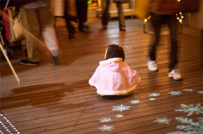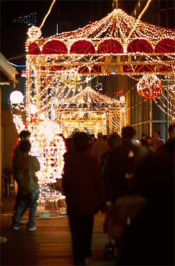 デパートの前にせり出した通路に、電球で飾られたいくつものオブジェが並んで人はその間