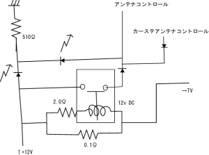 12V/8Wの液晶TVがある。動作時に電流を検知し、アンテナコントロール 12Vを印加する制御回路を作成せよ。但し、液晶TVのスイッチはインテリ ジェンスとし、待機電流(120mA程度)時には動作しないように回路作成を 行え。